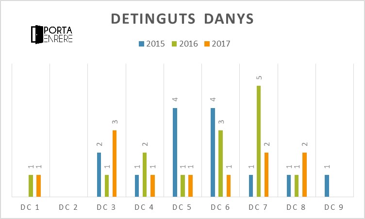 Malgrat l’increment de les denúncies, el número de detinguts ha anat disminuint durant aquests tres anys. En total, durant el període 2015 – 2017 es van produir 2.953 detencions a Tarragona. Així, l’any 2015 es van practicar 1.036 detencions, mentre que l’any 2017 van ser 983, produint-se una reducció del 5,1 %. L’any 2016 es van fer 934, però. Per districtes, el número 8 és qui presenta més detencions, amb 995 entre aquests tres anys. Així, en aquest districte censal l’any 2015 es van practicar 399 detencions, 311 el 2016 i 285 el 2017. Una disminució del 28,5 %.