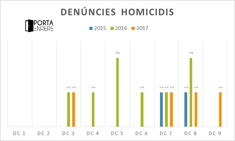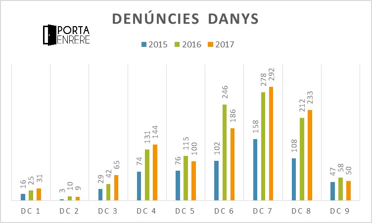 Un dels fets que més es comenta entre els ciutadans ha estat l’ocupació il·legal d’immobles. Les denúncies per aquest delicte han descendit des del 2015, quan es van registrar 99 denúncies a tots els districtes per 82 el 2017 (86 el 2015).