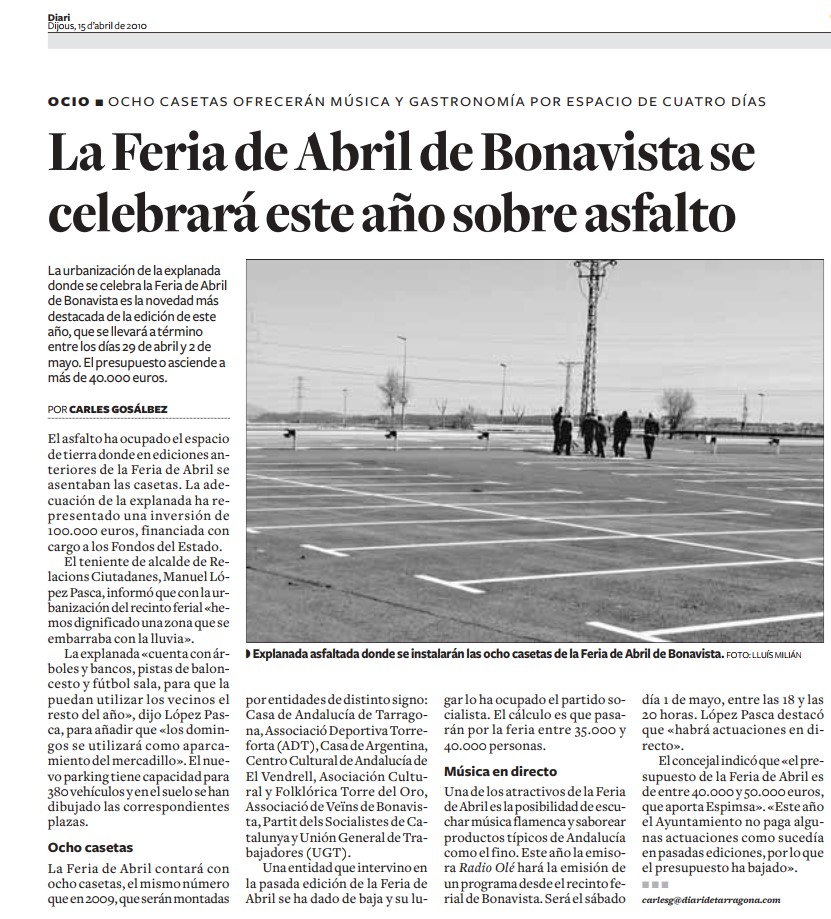 «Que l’Ajuntament assumeixi les despeses de la Feria de Abril és un exemple de la mala gestió dels recursos [públics]. Ballesteros intenta comprar vots i només vol donar diners als seus [simpatitzants del PSC]». El març de 2012, Maribel Rubio, regidora de Convergència i Unió (CiU) a l’oposició, apuntava directament al finançament públic d’un esdeveniment cultural, la Feria de Abril del barri de Bonavista, com un instrument polític de l’aleshores partit al govern de la ciutat de Tarragona, el PSC.